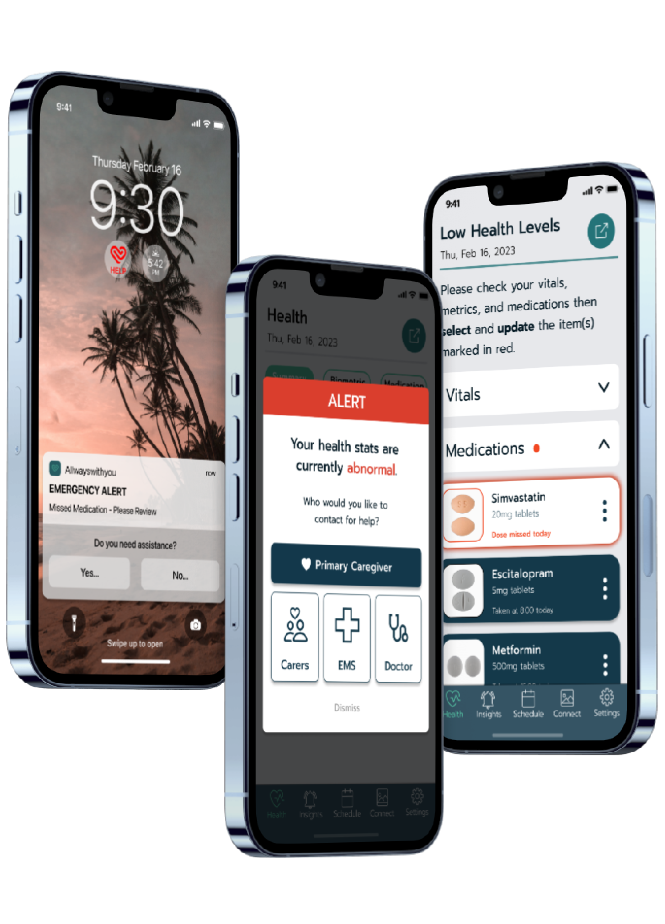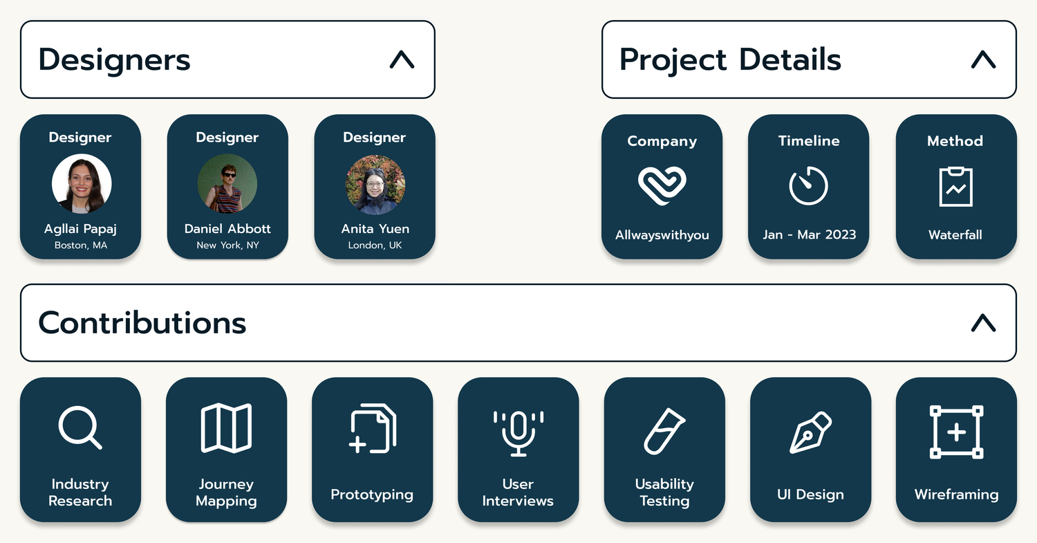 Allwayswith you is an Ireland based healthcare company looking to enhance services for folks choosing to “age-in-place”; a decision that promotes independence for seniors to stay in their own home as they age. AWY needed an emergency alert program that integrates into their pre-existing mobile app. The result is the collaborative effort of three Springboard designers that built an end-to-end function that will potentially prevent emergencies from occurring in the first place, while providing assistance when they do inevitably happen.