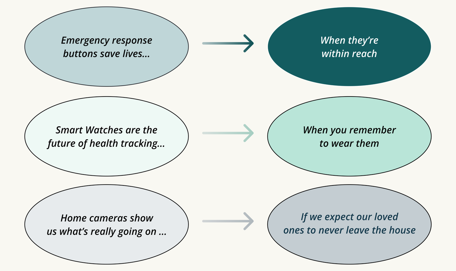 Throughout the research process, we learned about popular emergency response tools like Medical Guardian and Life Alert (Help! I’ve Fallen and I Can’t Get Up!), as well as other smart technologies like Apple Watches, home cameras, and sleep monitors that track vitals, sleep quality, fall detections, and more.