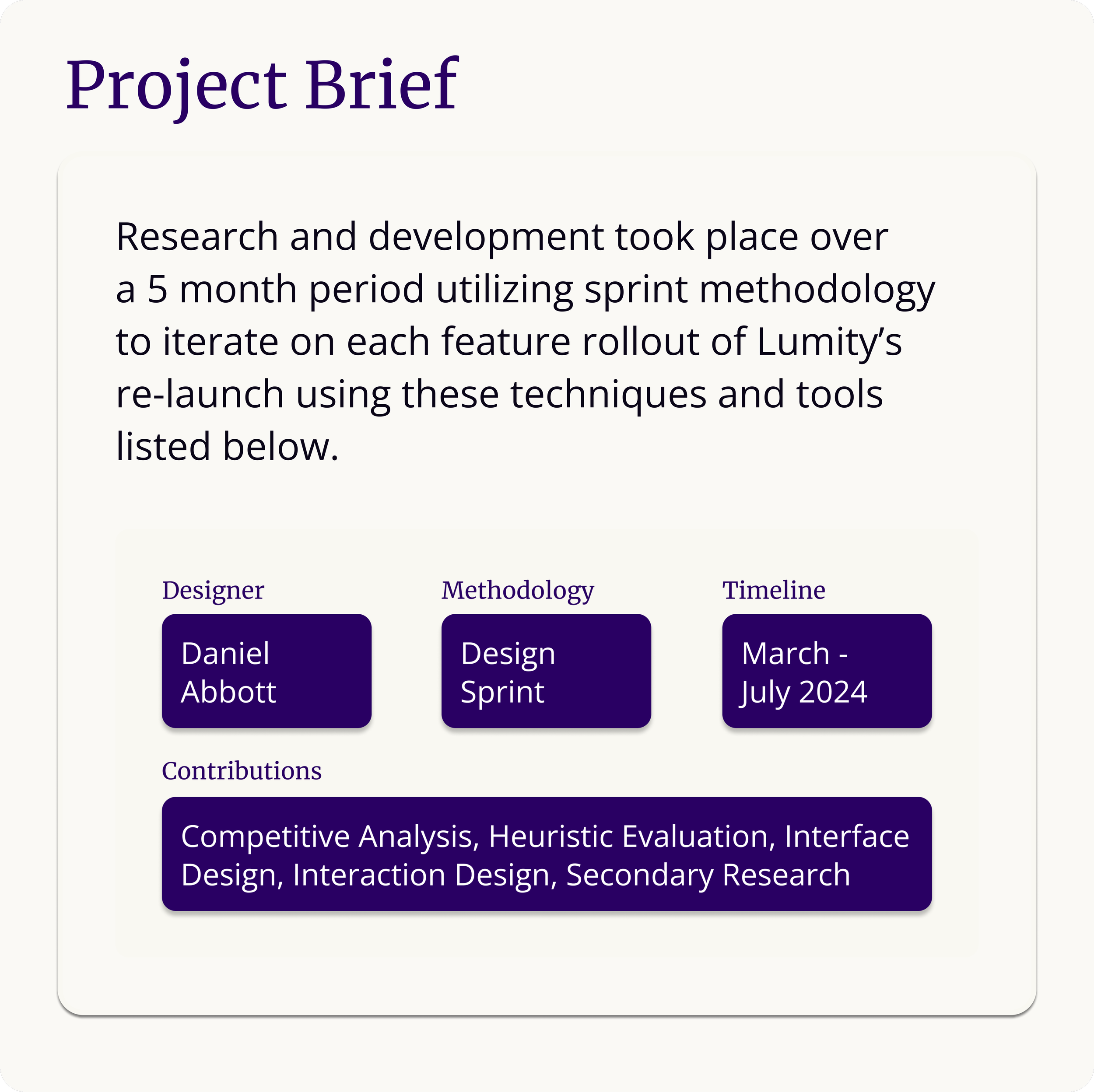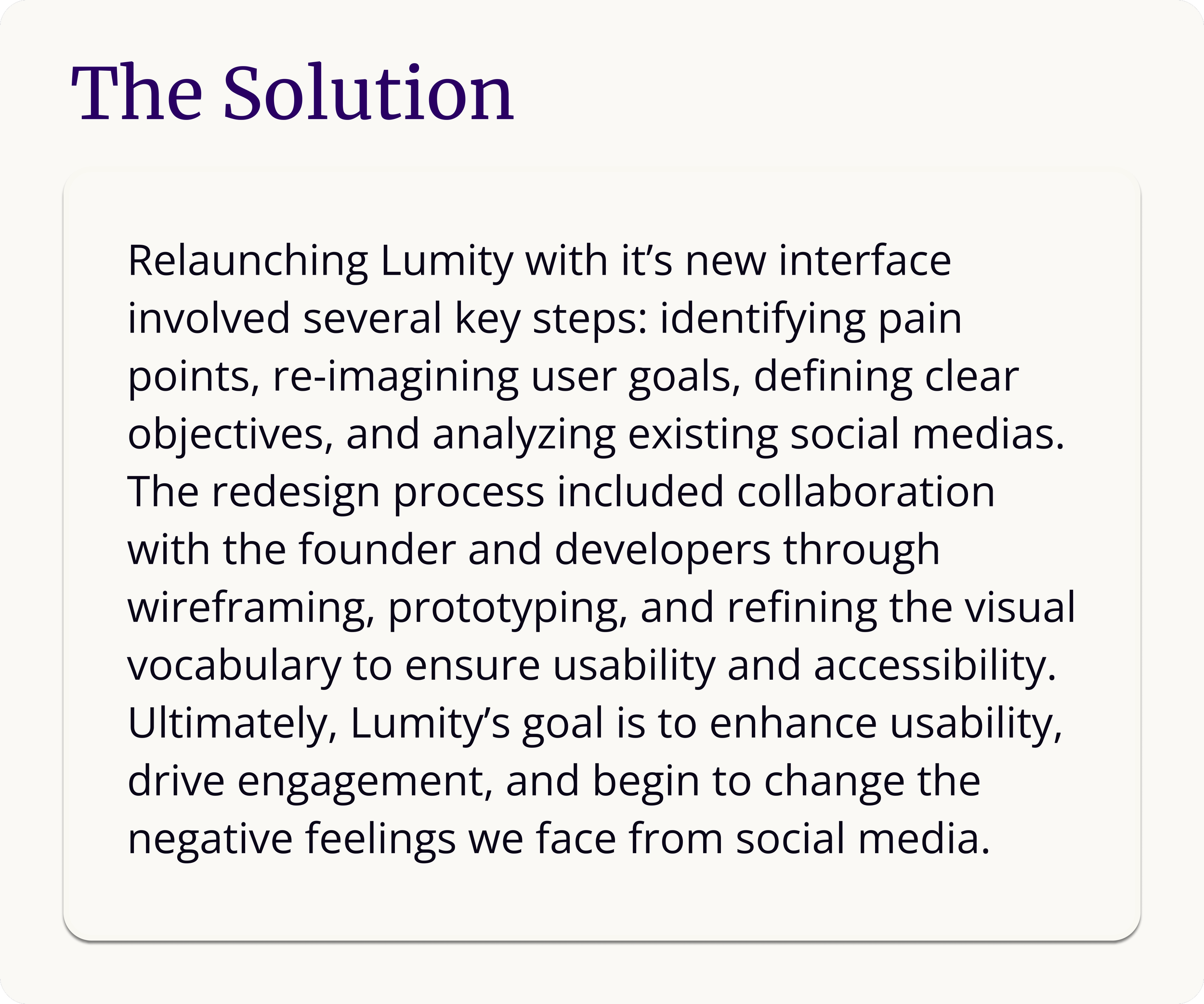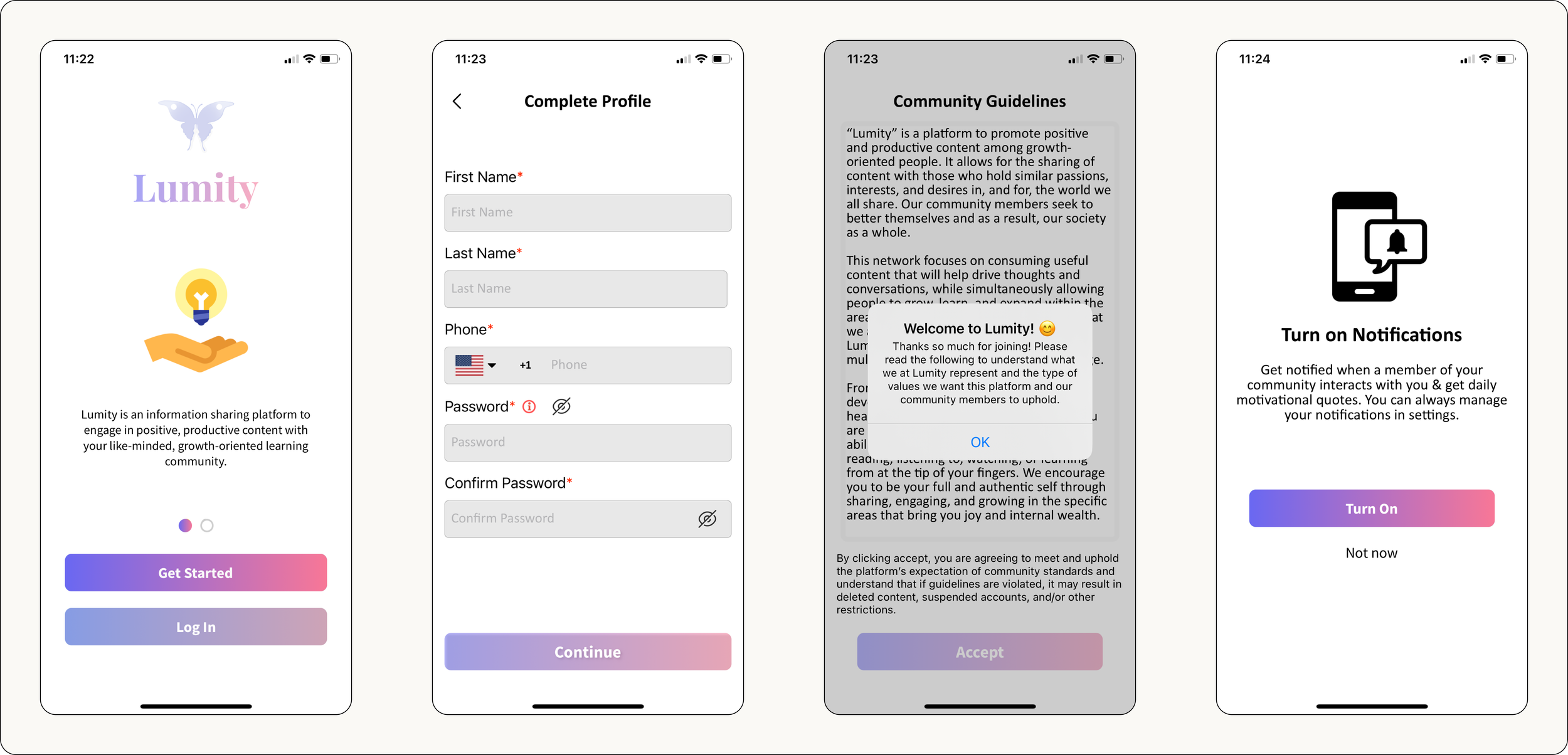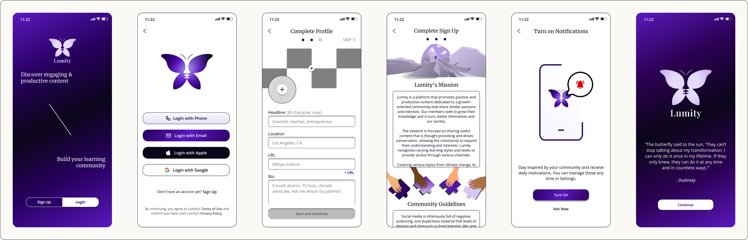 The Sign Up / Login flow was expanded to create an enticing and developed feeling, offering users delightful graphics along the way to help them ease them along in a process often seen as tedious. An updated logo, new color palette, and dynamic typefaces are introduced to get users acquainted with the Lumity brand.