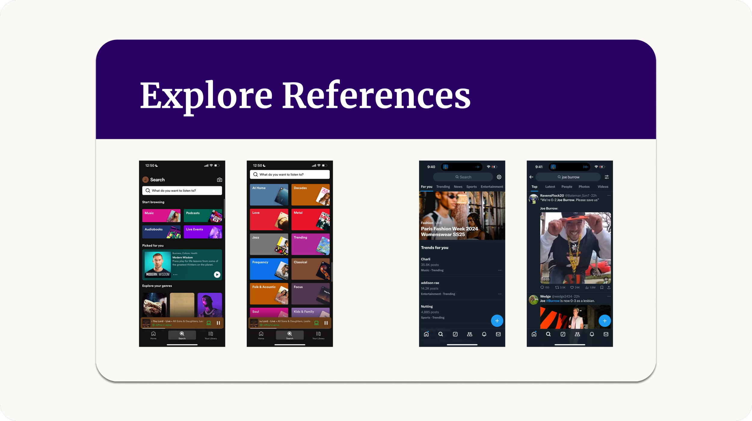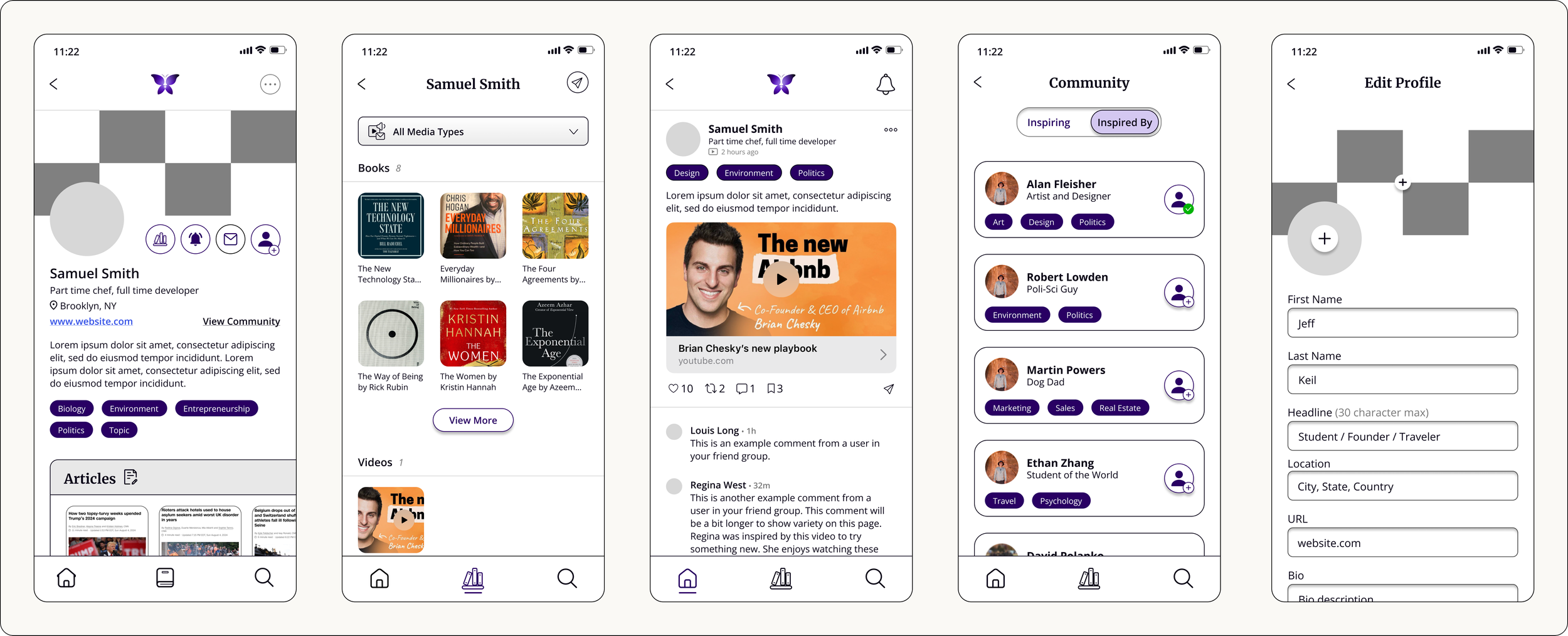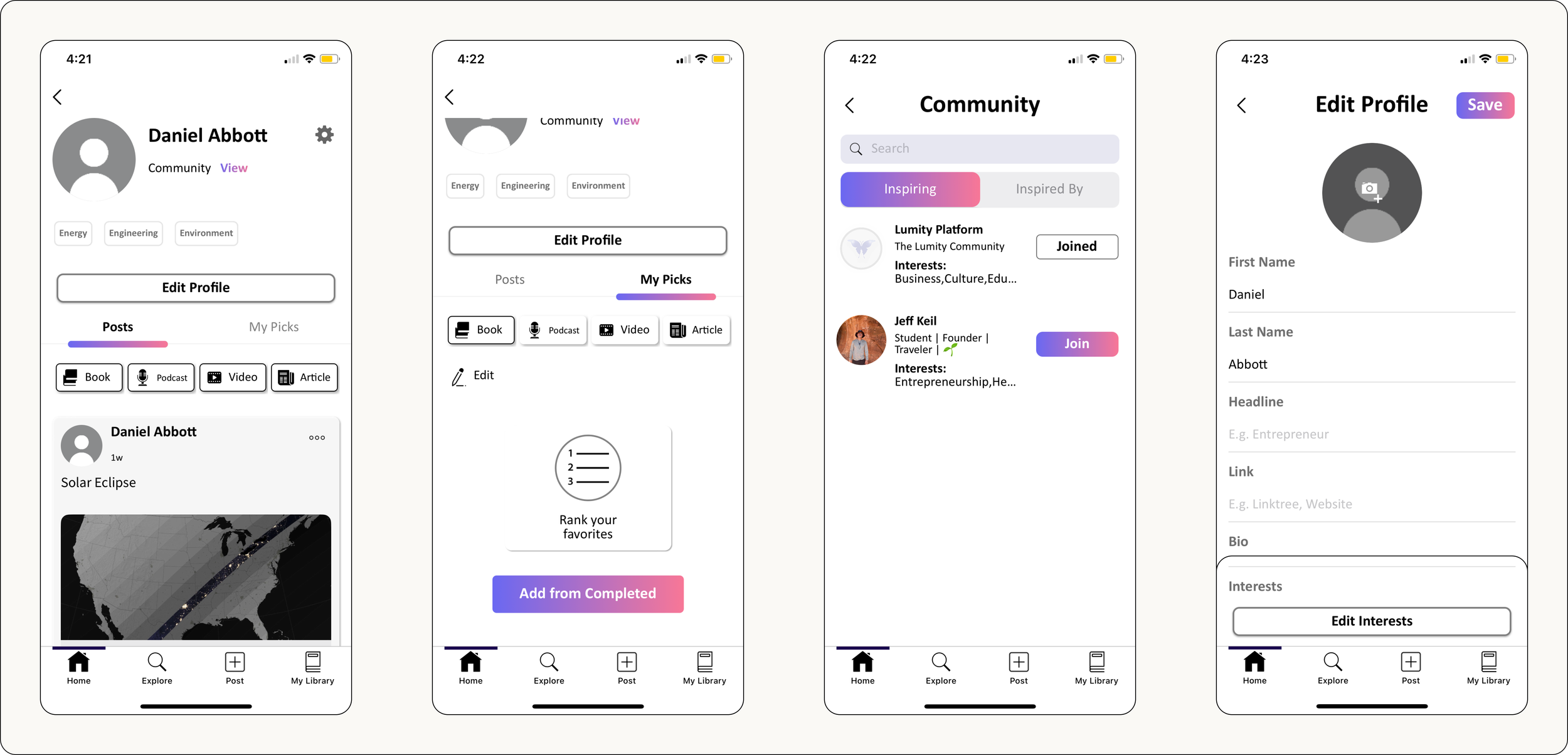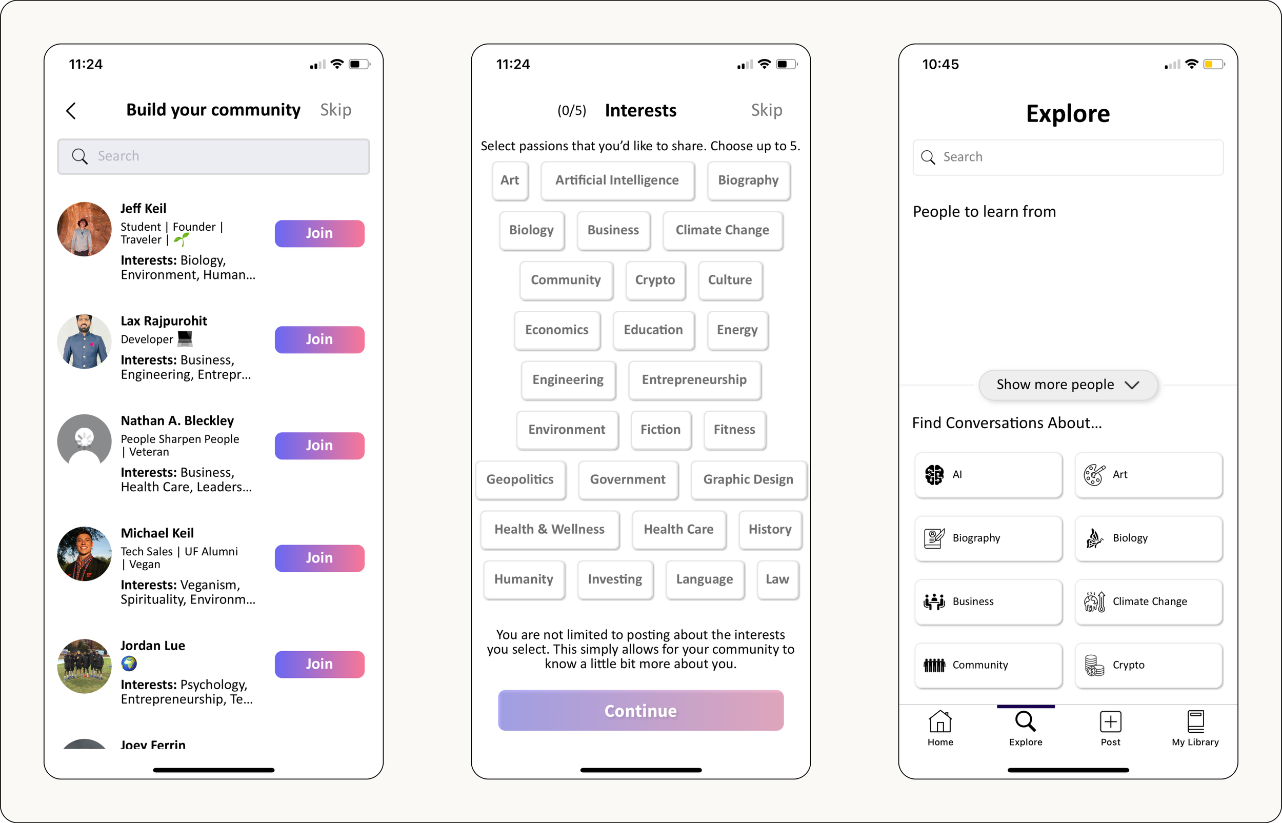 Previous LoginUpdated LoginThe explore function was combined into a single page via switch button. Users can now search get a glimpse of users posts and interests without the need to explore their entire profile. Interests are sorted by topic for easy finding and offer other similar subjects to explore with the option to view all posts with that interest’s tag.