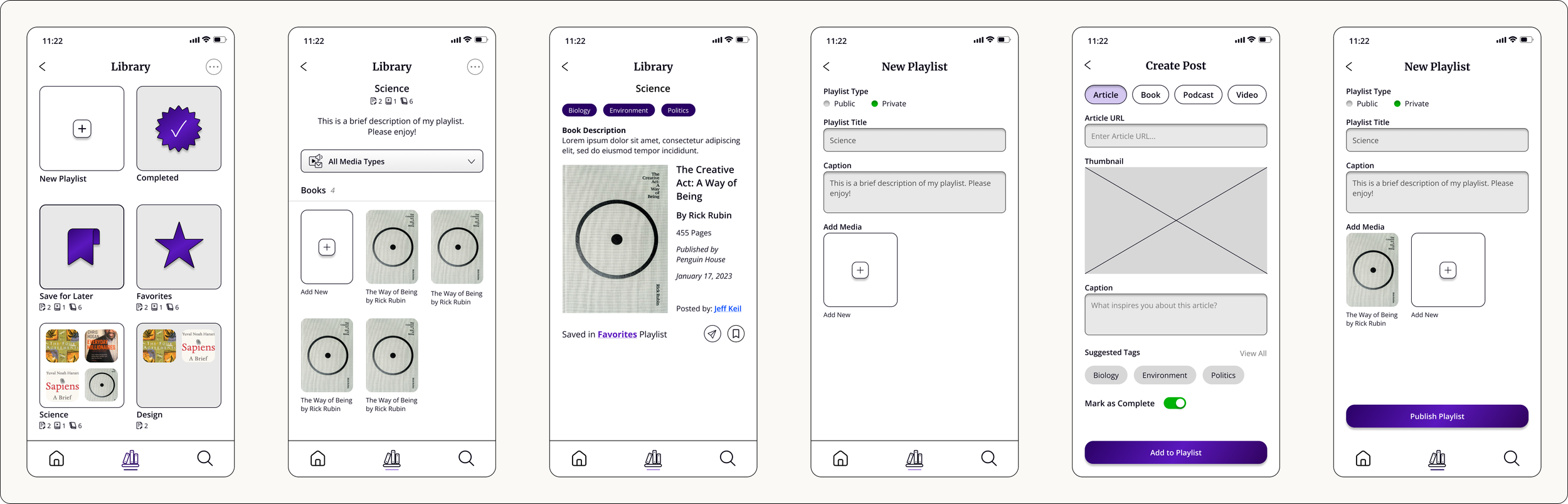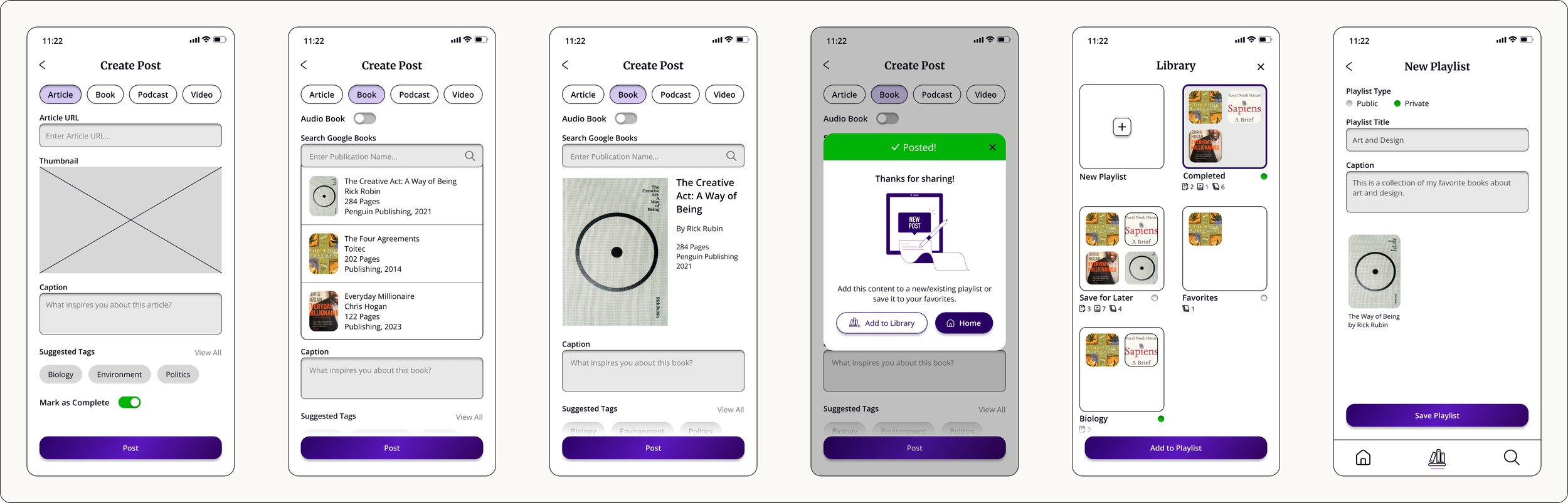 Previous HomeUpdated HomeThe Post flow is now a single page that continuously loads content instead of 4 separated process pages. Google API is added for an easy book search process. Tags were also built to allow for better categorization. Users now have the option to add an uploaded media to their library as well.